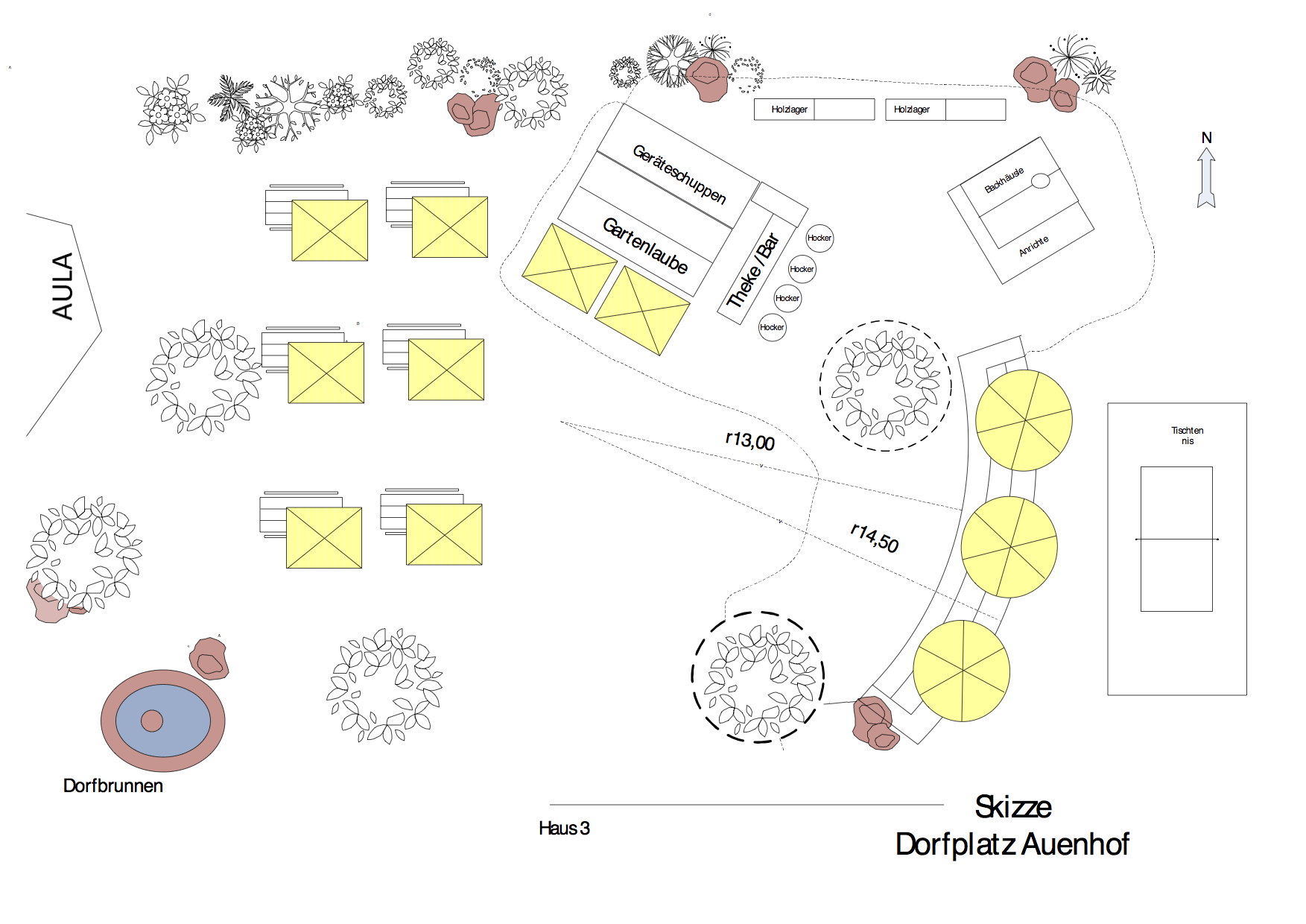 Ein kultureller Treffpunkt unter freien Himmel für Theatervorführungen, Spiele und Spaß mit 2-reihiger Sitzarena. Direkt neben dem Gemeinschaftshaus des Auenhofs wurde zwischen 2017 und 2019 dieser längst überfällige Dorfplatz nach den Plänen von Bernd Weisenburger gestaltet und von Eltern, Betreuten und Freunden an Wochenenden fertiggestellt.