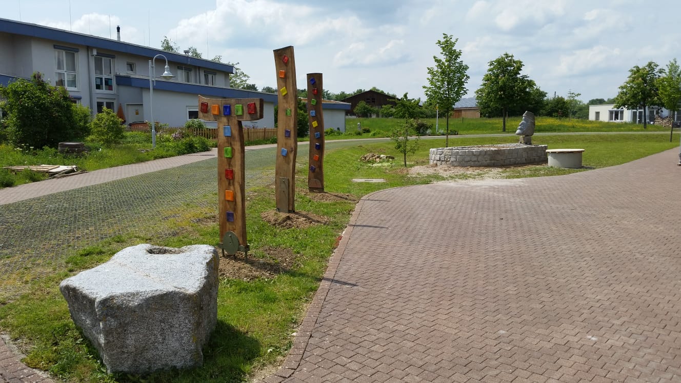 Auf dem Dorfplatz wurde ein Wasserspiel in Zusammenarbeit mit dem Künstler und Bildhauer Alfred Wolf entworfen, gehauen und errichtet. Ein mächtiger wasserspeiender Steinkopf füllt das runde von Pflastersteinen umgebene Wasserbecken. Bepflanzungen dazwischen umrahmen den „Brunnen“ der in Zeit von 2018 – 2019 von Eltern, Betreuten und der Kunst von Alfred Wolf www.wolfskunst.de